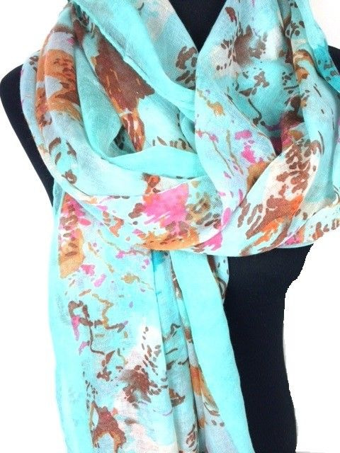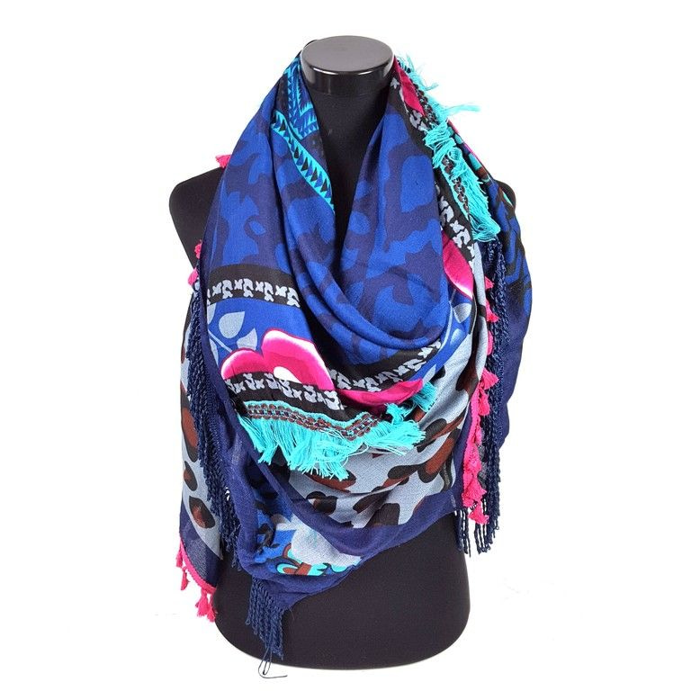 S_2539209 - DRIEHOEK SJAAL BLAUW BLOEMEN & TIJGER TURQUOISE FRANJES (1st)