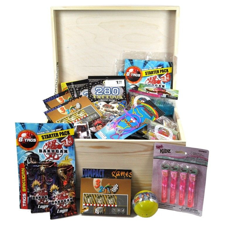 59916 - GRATIS - HOUTEN SCHATKIST MET 150 ST. MIX GRABBELTON ITEMS (150 St. + Gratis Kist)
