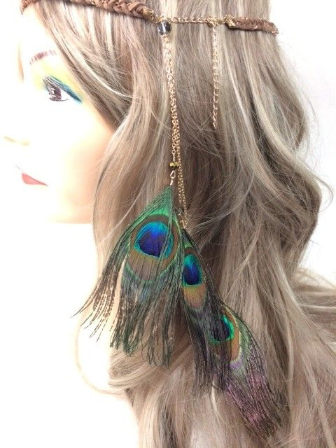 S_600029A - IBIZA LOOK GEVLOCHTEN HAARBAND BRUIN MET PAUWENVEREN (1st)