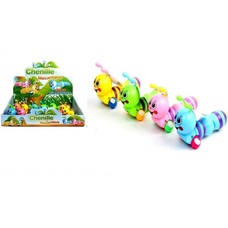 Leuke grote opwindbare rupsen in een display. Draai de rupsen op en laat hem los.. vervolgens rijdt deze rups vanzelf naar voren. Wordt in Mix vrolijke kleuren geleverd in een display.