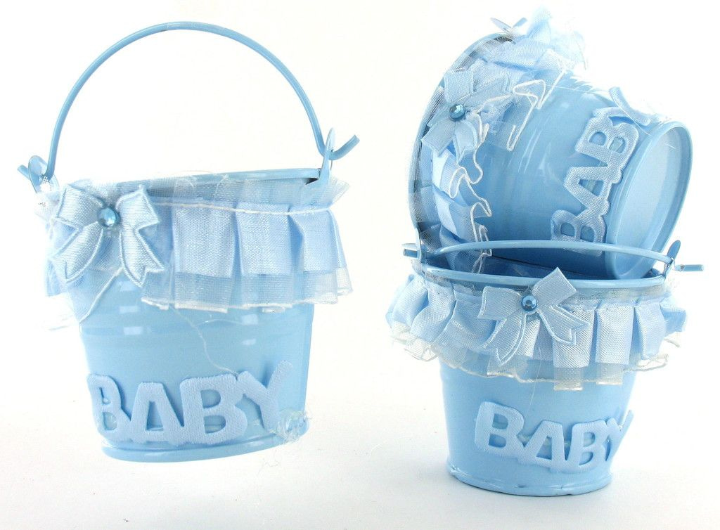 Schattige kleine decoratie emmertjes. Mooi gedecoreerd met franjes en strikjes. Een leuk kleinigheidje als bedankje voor de kraamvisite of op een babyshower/feestje.