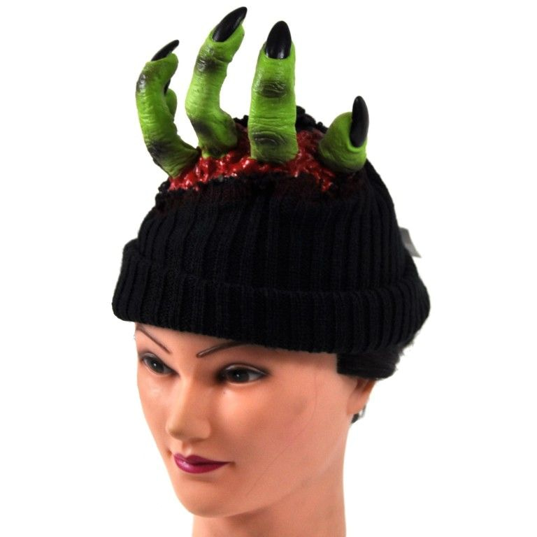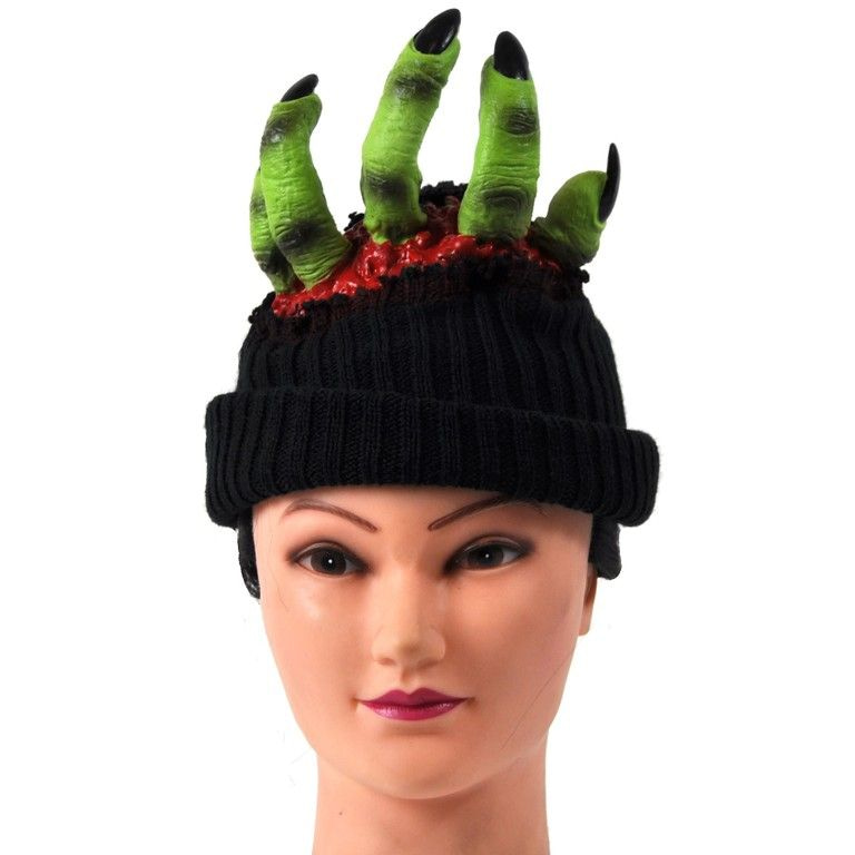 Een enge wintermuts met een griezelige hand die uit de bovenkant van je hoofd komt. Leuk voor carnaval, halloween of gewoon om iemand mee bang te maken.