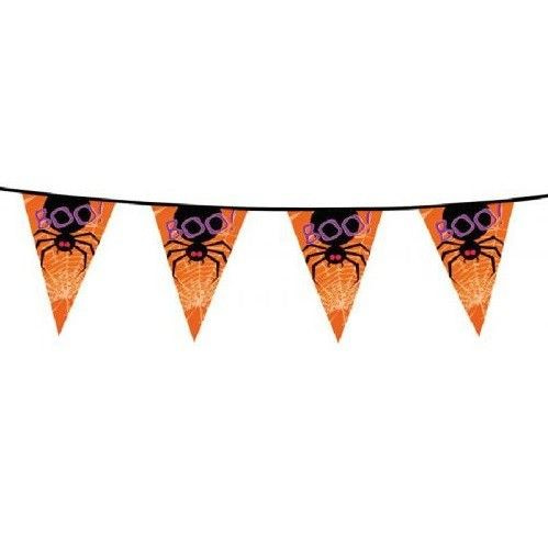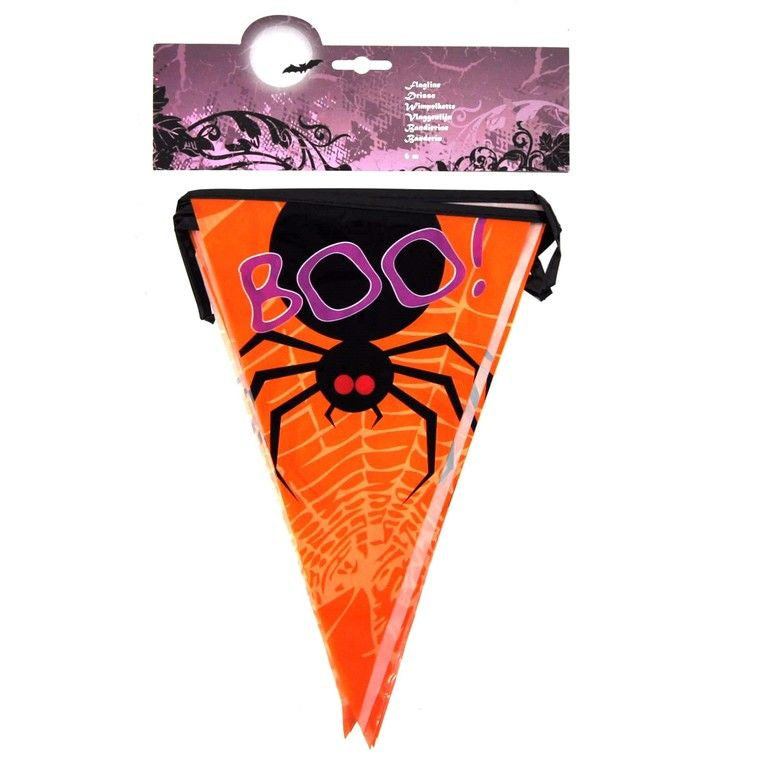 Een vlaggenlijn van 6 meter lang met driehoekige vlaggetjes. Op de vlaggetjes staat een zwarte spin en de tekst "BOO!".