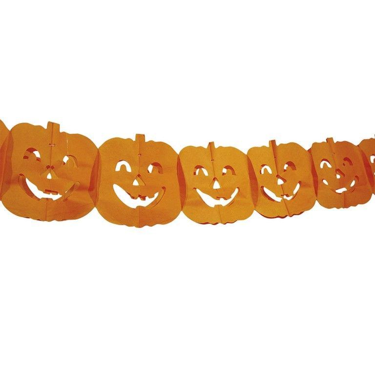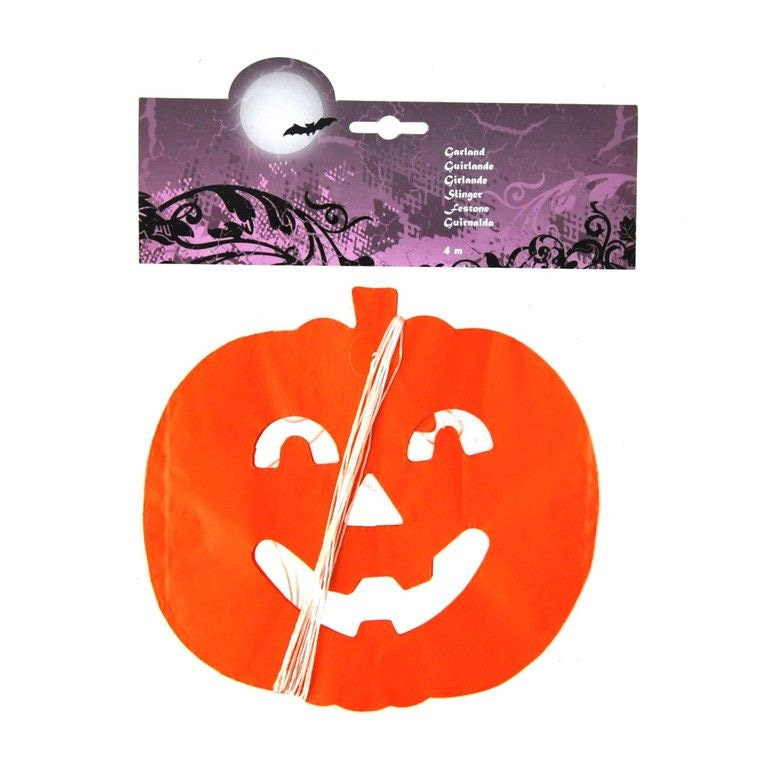 Een guirlande van 4 meter lang met pompoenen er aan. De pompoenen hebben enge gezichtjes.