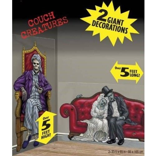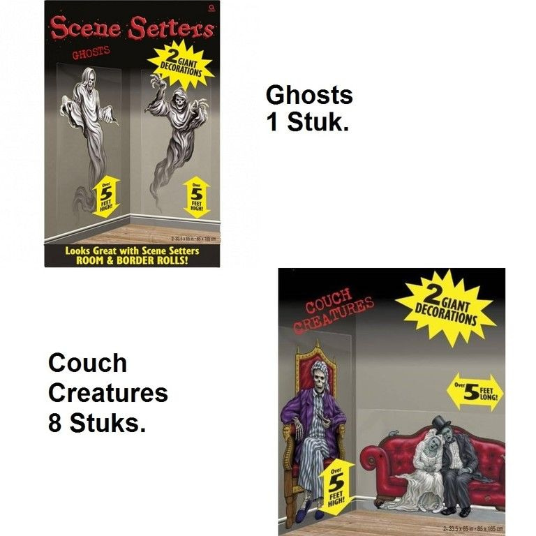 Mega grote muur decoratie van circa 150 cm. lang. Deze pakketten bestaan uit twee grote plastic zijlen met daarop enge figuren. Plak deze decoratie aan de muur en het is net alsof de enge figuren echt in de kamer zitten.