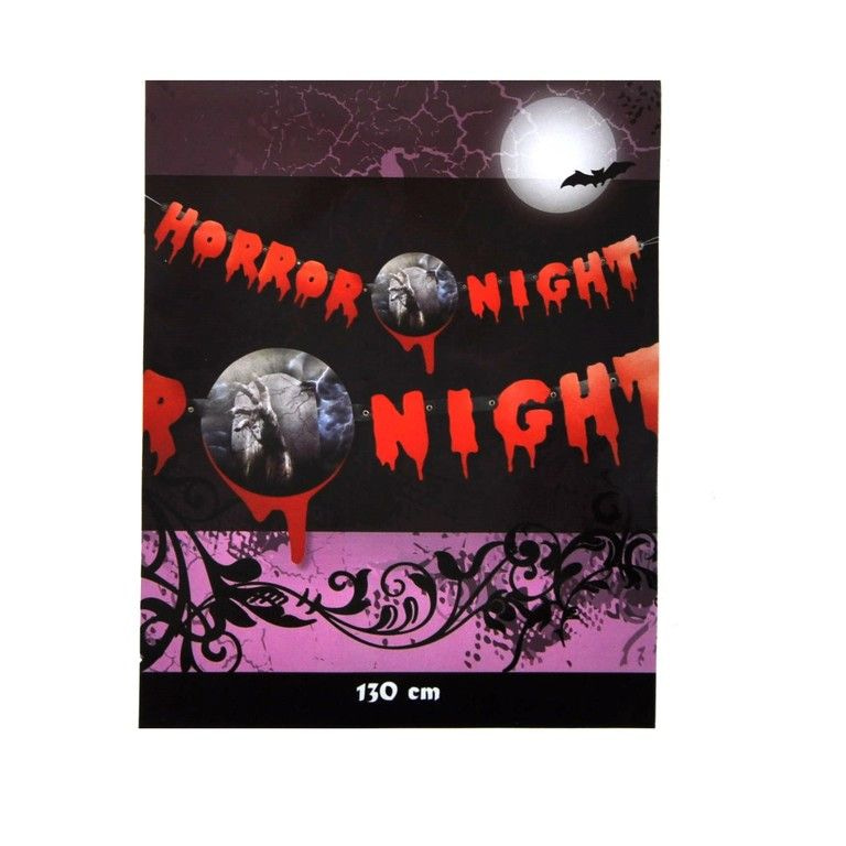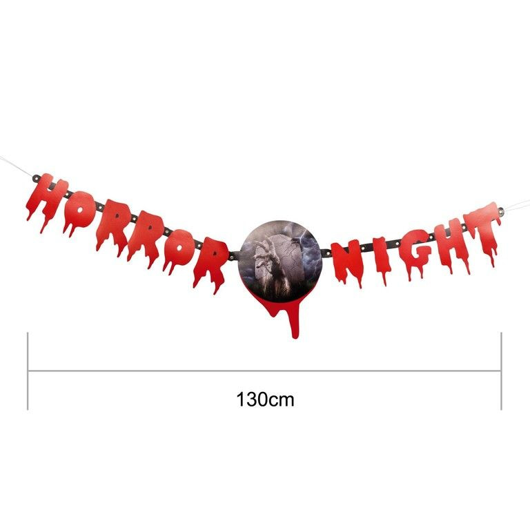 Een letterslinger met de tekst "Horror Night" en in het midden een plaatje van een zombie hand dat uit een graf komt. Leuk als decoratie voor themafeesten, carnaval en Halloween.