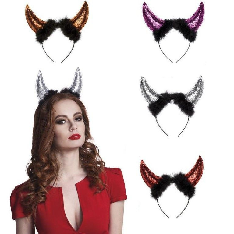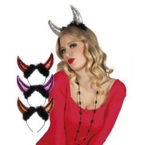 Een mooie diadeem met daarop 2 duivels hoorntjes vol met glittertjes. De diademen worden in verschillende kleuren geleverd en zijn ideaal voor themafeesten, Carnaval en Halloween.