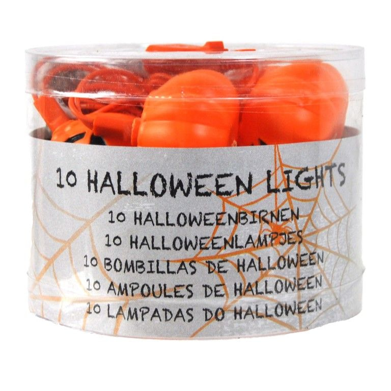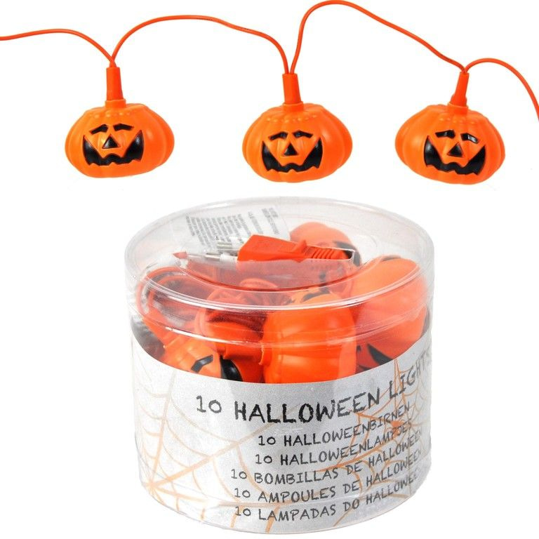 Decoratie verlichting voor themafeesten, Carnaval en Halloween. Deze verlichting is circa 2.85 meter lang en heeft 10 lampjes in de vorm van een pompoen.