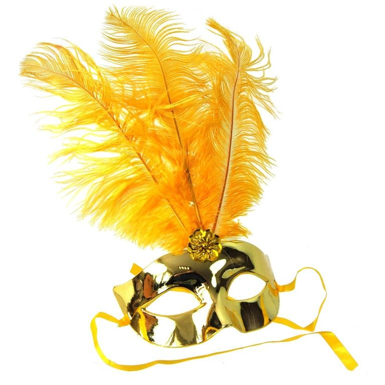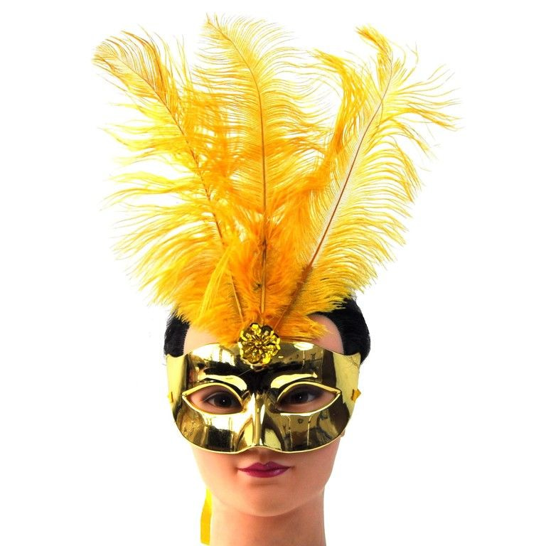 Een schitterend feestmasker voor evenementen, carnaval en verkleedfeesten. Dit masker is volledige goudkleurig en heeft veren aan de bovenkant.