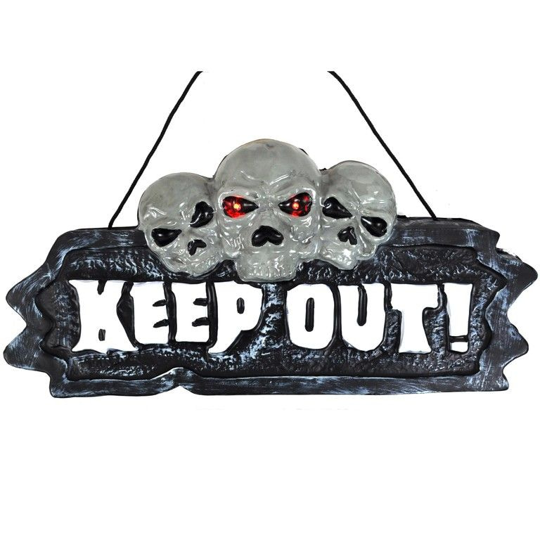 Een groot decoratie bordt met de tekst "Keep Out!" erop en drie doodskoppen erboven. Het bord is voorzien van licht en het geluid van schreeuwende mensen en geesten. Super leuke decoratie voor Carnaval, Halloween en themafeesten.