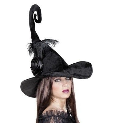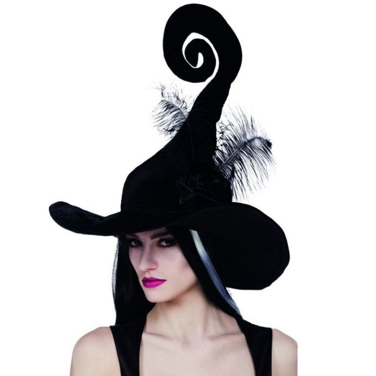 Mooie grote heksenhoed met zwarte veren erop en staaldraad in de punt. Ideaal voor feesten, carnaval, halloween en andere feestelijke gelegenheden.
