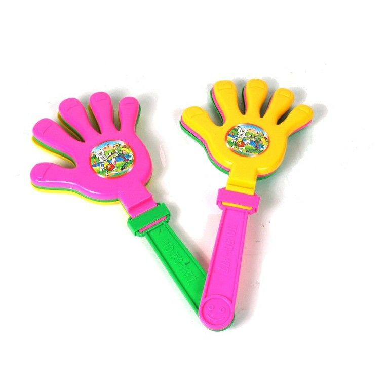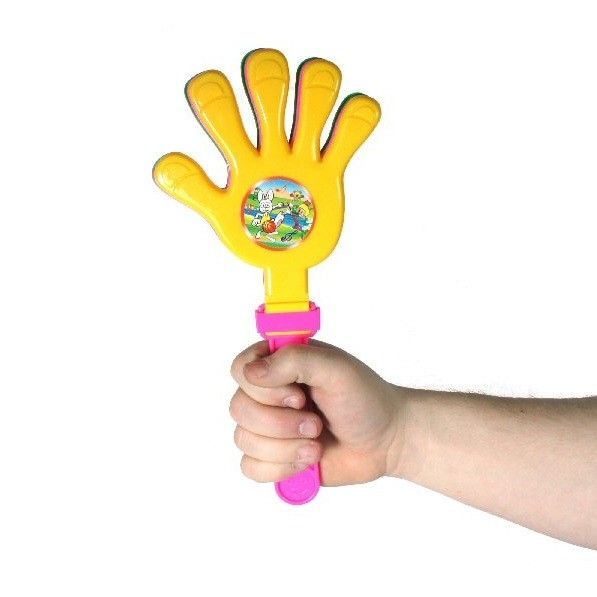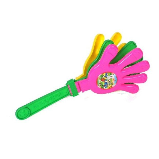 Vrolijk gekleurd klaphandje van 28.5 centimeter lang. Heerlijk herrie maken met de kinderen. Ideaal voor feestjes en carnaval.