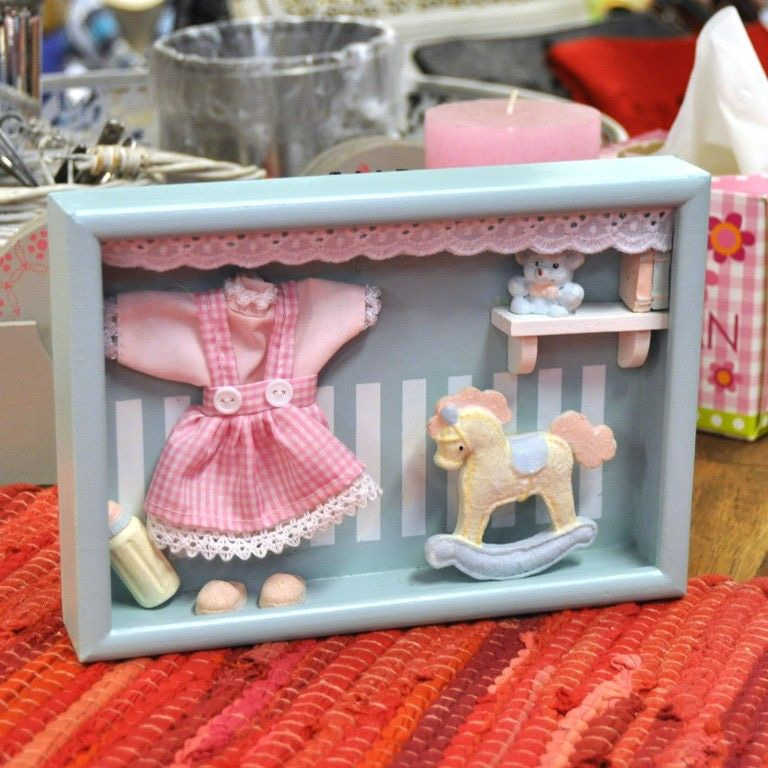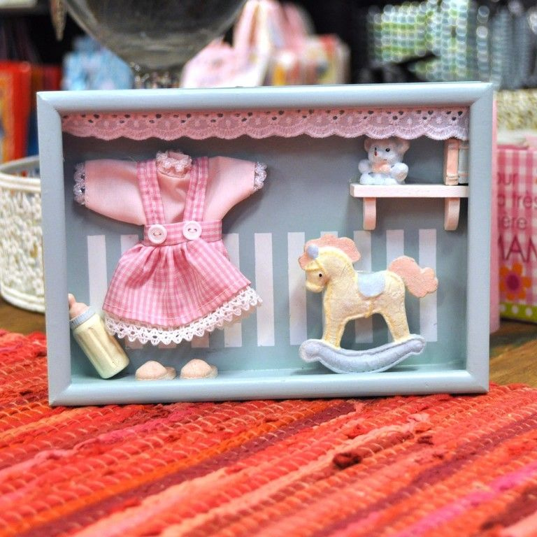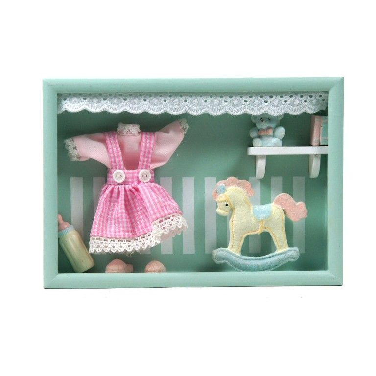 Een diep fotolijstje met meubulair erin, net alsof je in een kinderkamer kijkt. Mooi en schattige decoratie voor in de kinderkamer. De wanddecoratie kan worden neergezet of worden opgehangen.