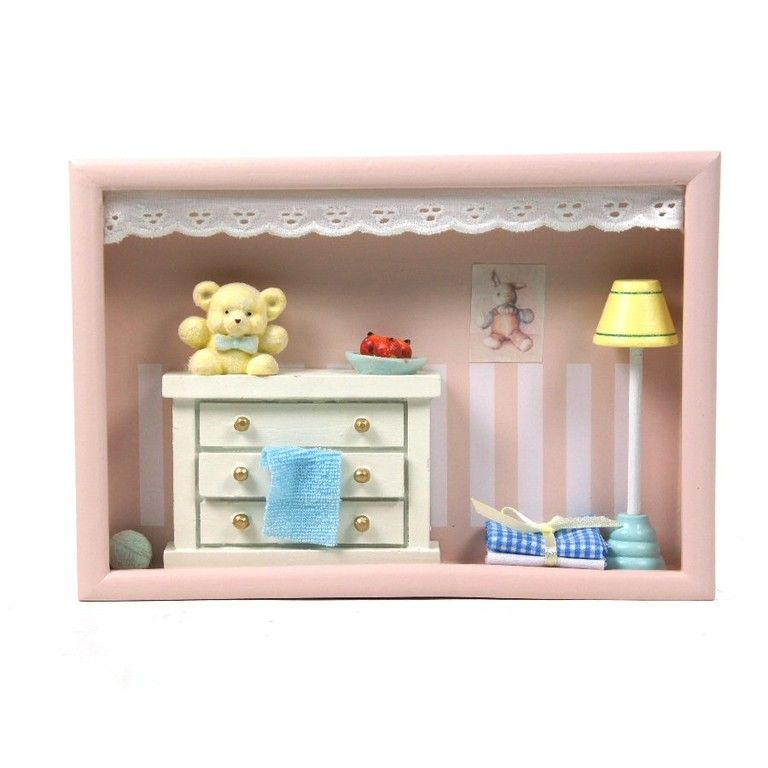 Een diep fotolijstje met meubulair erin, net alsof je in een kinderkamer kijkt. Mooi en schattige decoratie voor in de kinderkamer. De wanddecoratie kan worden neergezet of worden opgehangen.