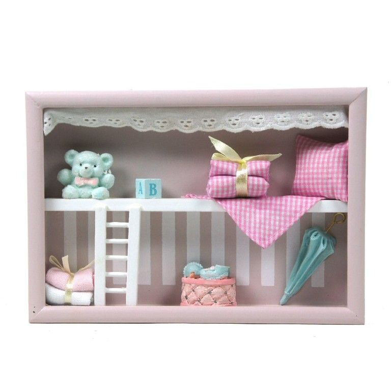 Een diep fotolijstje met meubilair erin, net alsof je in een kinderkamer kijkt. Mooi en schattige decoratie voor in de kinderkamer. De wanddecoratie kan worden neergezet of worden opgehangen.