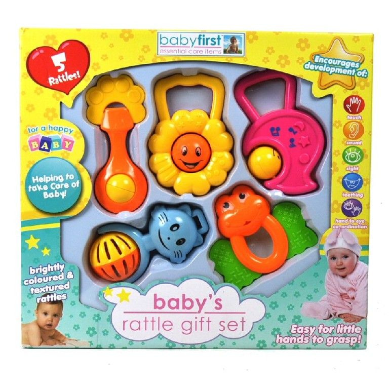 Mooie grote doos gevuld met 5 verschillende rammelaars. Hartstikke leuk cadeau voor een pasgeboren baby.