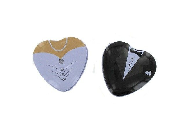 Blikken opbergdoosjes voor kleinigheidjes in de vorm van een hartje. De opdruk van de opbergdoosjes betreft een smoking en een trouwjurk.