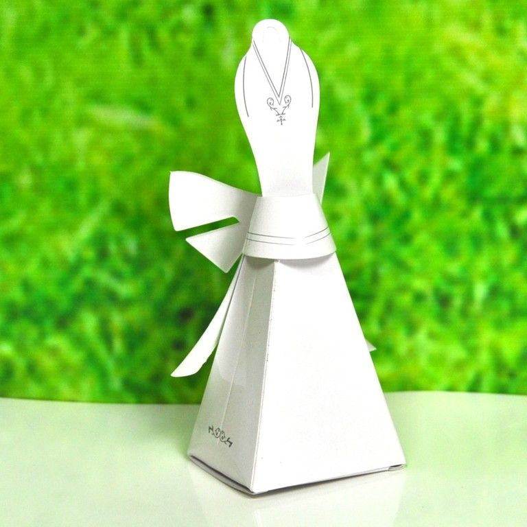 Schitterend doosje in de vorm van een trouwjurk. Speciaal voor traktaties op bruiloften. In dit tasje kun je wat leuke snoepjes doen zoals bon bonnetjes, chocoladehartjes, suikerboontjes of een leuk presentje.