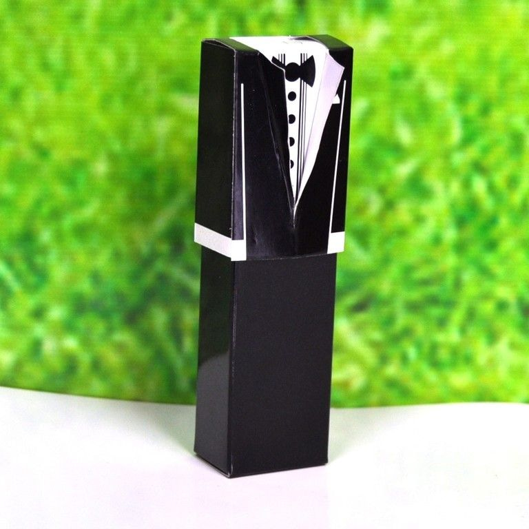 Schitterend doosje in de vorm van een smoking. Speciaal voor traktaties op bruiloften. In dit tasje kun je wat leuke snoepjes doen zoals bon bonnetjes, chocoladehartjes, suikerboontjes of een leuk presentje.