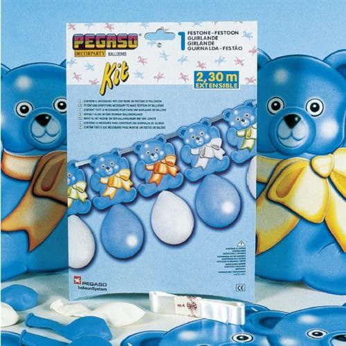 Lange ballonnenslinger van wel 2.3 meter voorzien van grote decoratie beren. De beren zijn circa 28 cm. hoog en hebben een ballon aan de onderkant hangen. Deze slinger is snel en gemakkelijk in elkaar te zetten, en is de ideale decoratie voor bij een geboorte.
