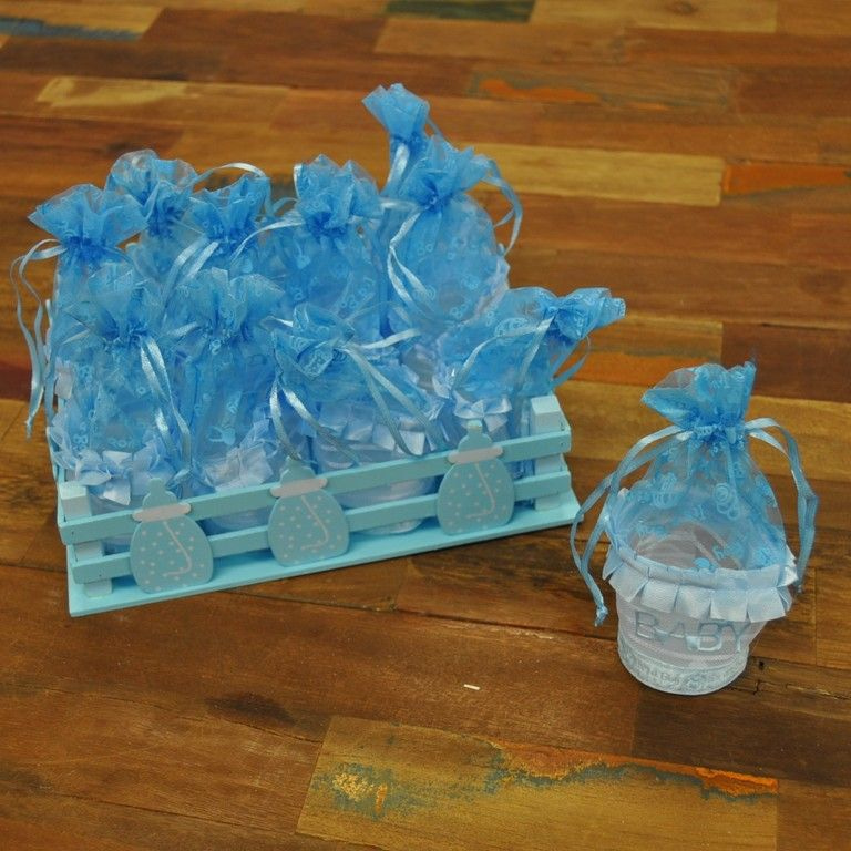 Het kratje is gevuld met 12 stuk blauwe geschenkverpakkingen.
