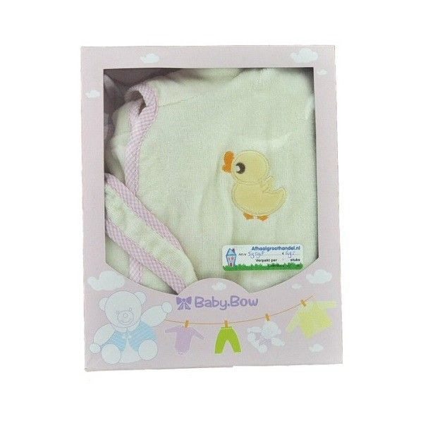 Zeer schattige kinderbadjas, voorzien van een schattig eendje als opruk. Leuk verpakt in mooie doorkijkdoos. Ideaal cadeau voor de kleine kinderen.