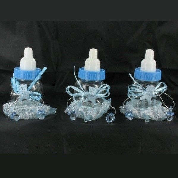 Schitterende kleine decoratie baby drinkflesjes. Mooi gedecoreerd met franjes en strikjes. Een leuk kleinigheidje als bedankje voor de kraamvisite of op een babyshower/feestje.