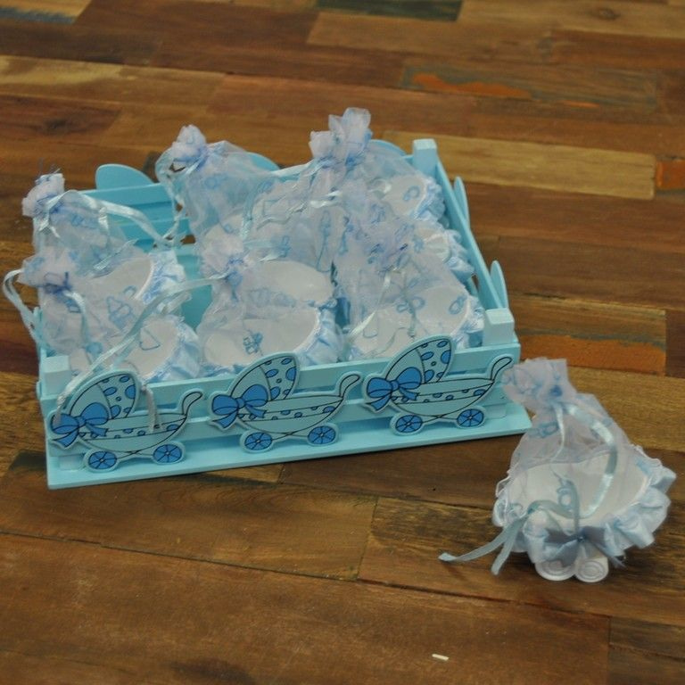 Mooi blauw decoratie kratje met op de zijkant kinderwagens gedecoreerd. In het kratje zitten 9 stuk blauwe decoratie kinderwagens.