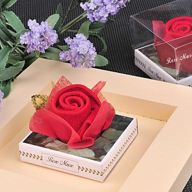 Het gastendoekje gevouwen in de vorm van een roos heeft de afmetingen van 20 bij 20 centimeter. De vorm van de handdoek wordt in stand gehouden d.m.v. een elastiekje. En de roos is verpakt in een doorzichtige box.