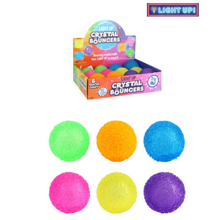 Deze Lichtgevende Crystal Stuiterbal combineert speelplezier met een spectaculair visueel effect. De stuiterbal heeft een royale diameter van 5 cm en is voorzien van een transparante 'crystal' buitenlaag met glitters, waardoor de lichtgevende kern extra goed tot zijn recht komt zodra de bal stuitert.