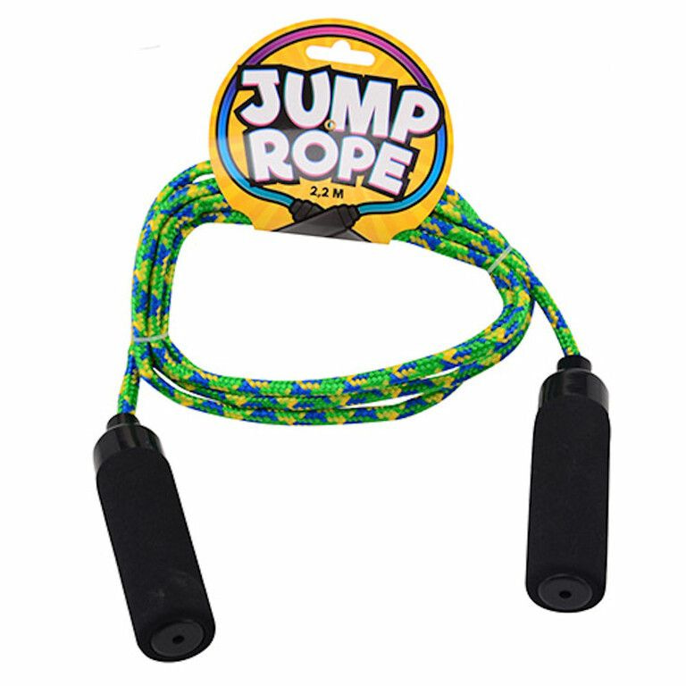 Stevig springtouw, multikleur, lengte 220 CM. Voorzien van stevig handvat. Wordt in Mix kleuren geleverd.
