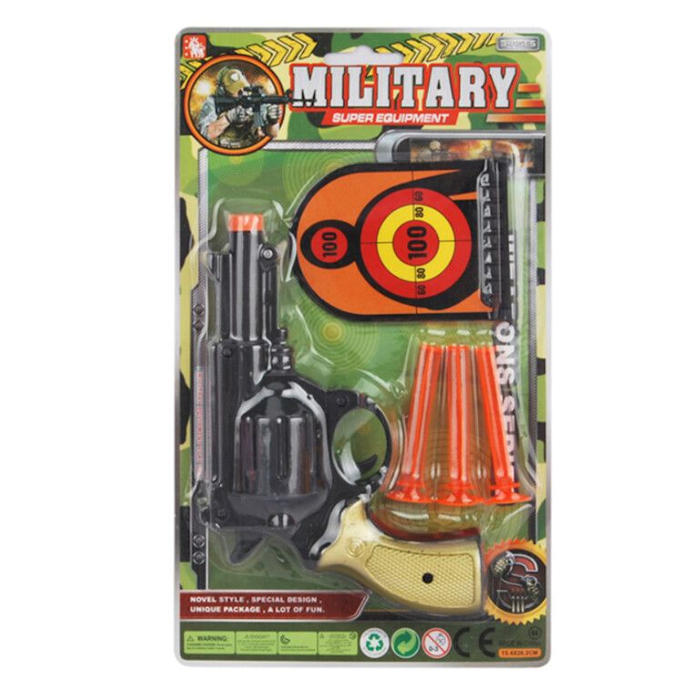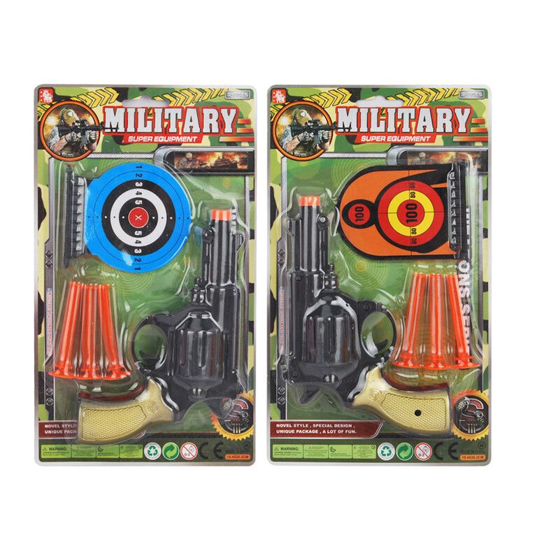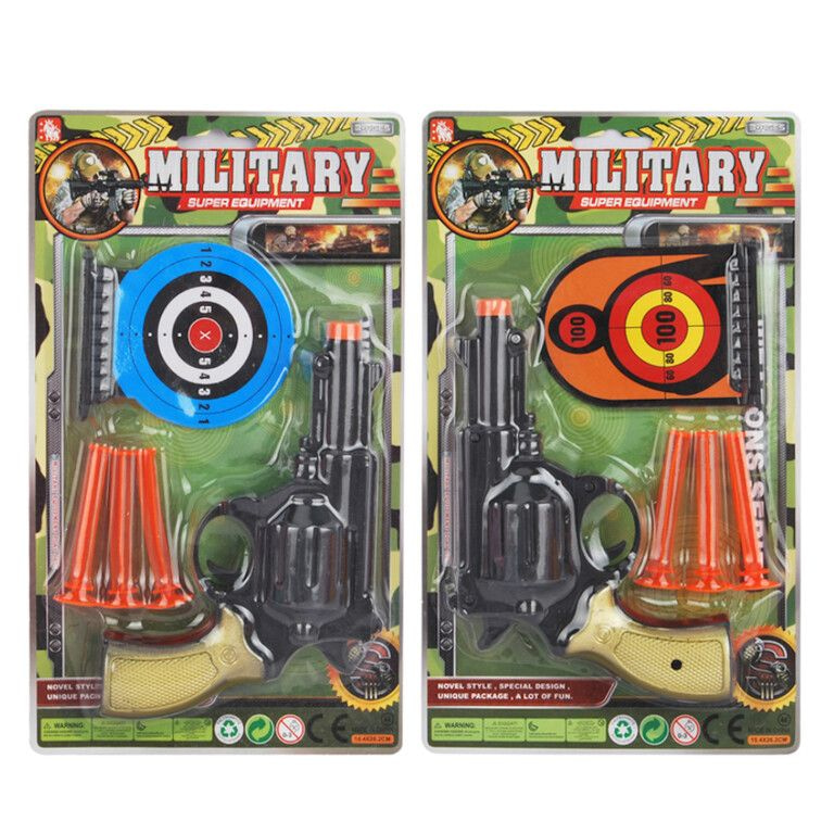 Breng de actie naar jouw assortiment met deze stoere Militaire Pistool Set! Perfect voor urenlang speelplezier. Elke set wordt geleverd op een handige blisterkaart en bevat een speelgoedpistool, drie veilige pijltjes met 3x zuignappen en spannende target poppen om op te richten.