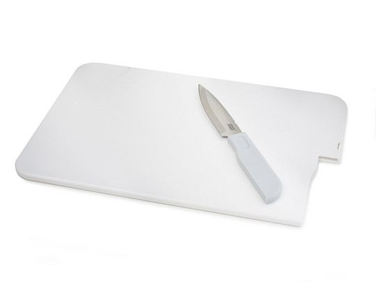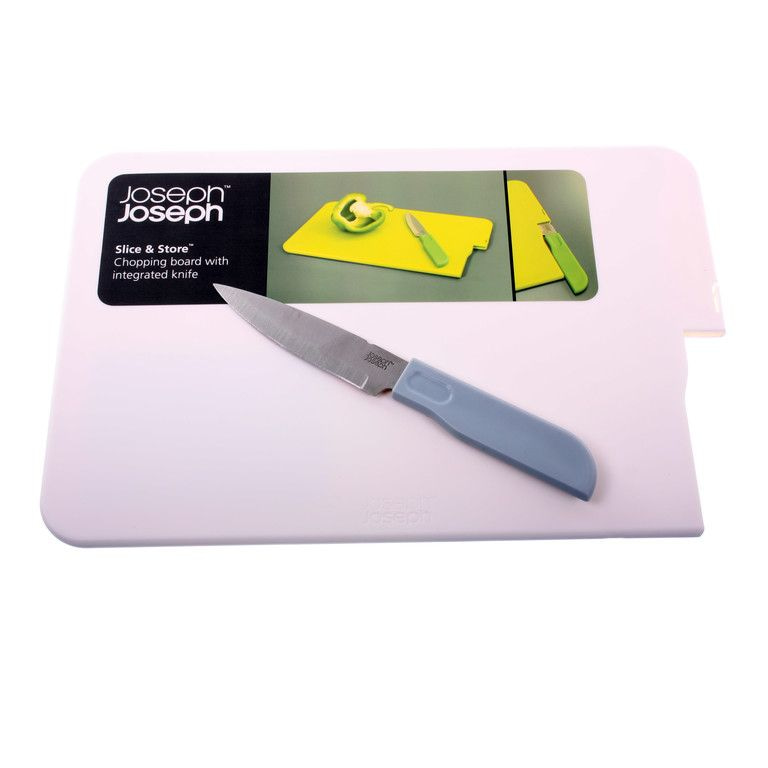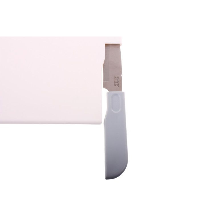 Luxe snijplank van het merk "Joseph Joseph". De snijplank is voorzien van een geïntegreerd mes om direct te kunnen beginnen met snijden.