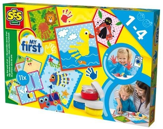 SES Mijn eerste kunstwerk is de perfecte manier voor ouders om hun kindje kennis te laten maken met verf. Deze set bevat vrolijke voorbedrukte kaarten, waarop staat aangegeven waar je je hand (of voet) kunt plaatsen. Smeer het handje in met verf en plaats het op de kaart. Met de drukwerk details maak je het helemaal af. Het resultaat is altijd goed!