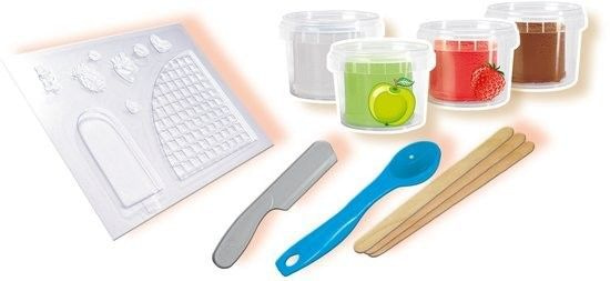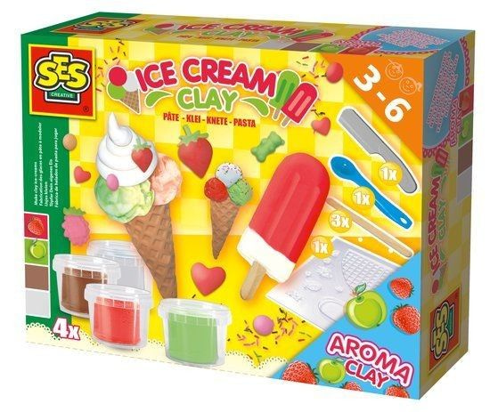 "IJsliefhebbers opgelet! Je maakt nu de leukste ijsjes van klei. In deze set van SES zitten vier kleuren klei, waarvan twee geurklei. Met de ijsschep, de mal en het plastic mesje kun je schepijsjes of ijslolly's maken. Decoreer je ijsjes met vrolijke toppings. Helaas zijn ze niet om echt op te eten, maar wel leuk om te maken en aan te ruiken! Inhoud: 4 kleuren klei, mal om ruitpatroon te maken, ijsschep, plastic mes en ijsstokjes."