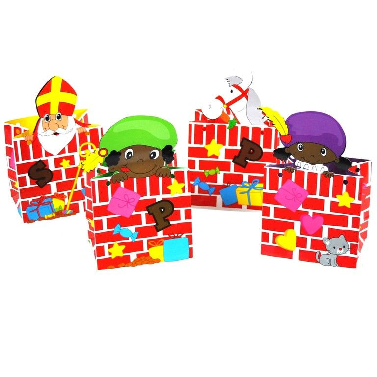 Leuke pepernoten en snoepbakjes van Sinterklaas en Zwarte Piet. De bakjes zijn in de vorm van Sinterklaas, Zwarte Piet en Amerigo die door de schoorsteen komen. De bakjes zijn 16 x 10 x 7 cm.