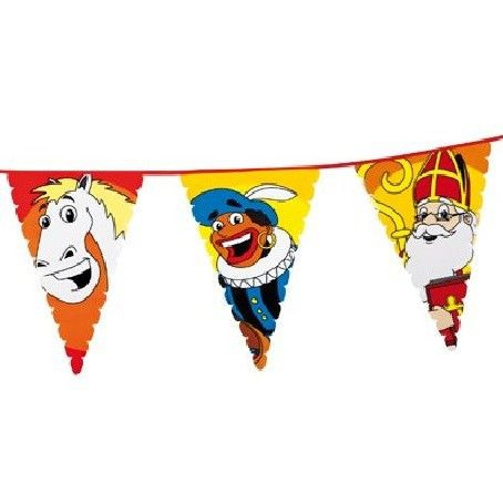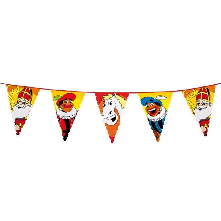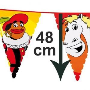 Een grote decoratie vlaggenlijn met zwarte piet, sinterklaas en het paard van sinterklaas. De vlaggenlijn is 6 meter lang, en de vlaggen 48 cm. hoog.