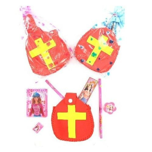 Erg leuke tasje in de vorm van een Sinterklaas mijter, voorzien van een koord en gevuld met schrijfartikelen zoals een lineaal, potloden, schaartje, gum en puntenslijper.