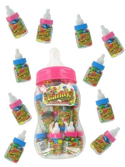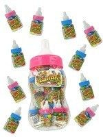 Kleine drinkflesjes voor baby's, gevuld met lekker snoep.
