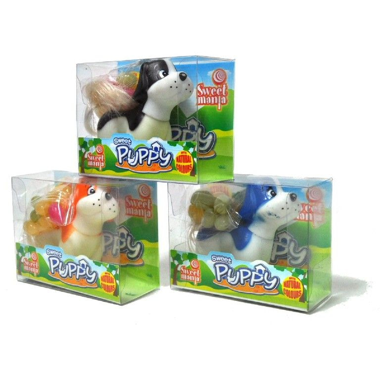 Schattig hondje verpakt in doorkijkverpakking. Samen verpakt met lekkere snoepjes.