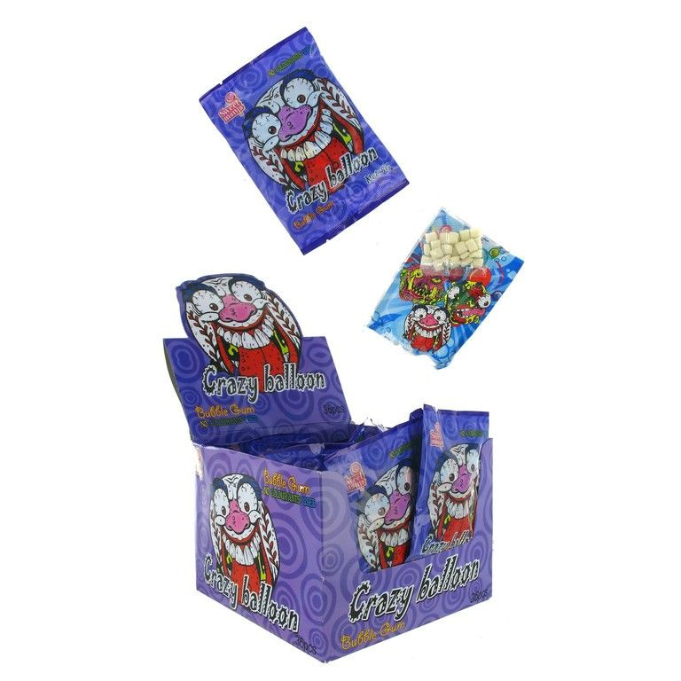 "Crazy Ballon", druk het zakje in en de ballon blaast zichzelf op! Samen verpakt met lekkere kleine kauwgommetjes
