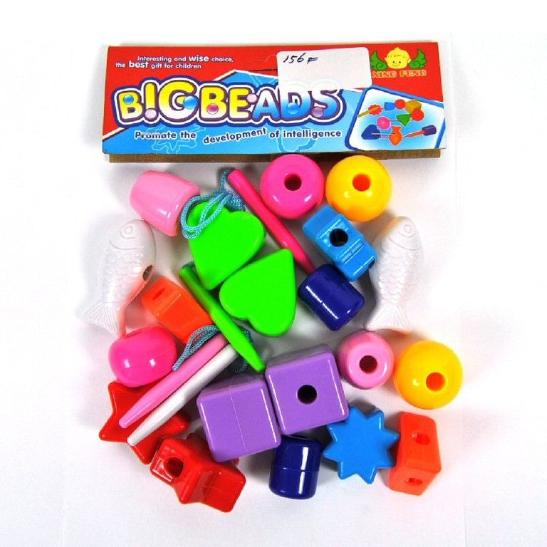 Grote kralen met touw en (nep)naald verpakt in een zakje. Met "naald" en draad kun je alle kralen het touw rijgen.