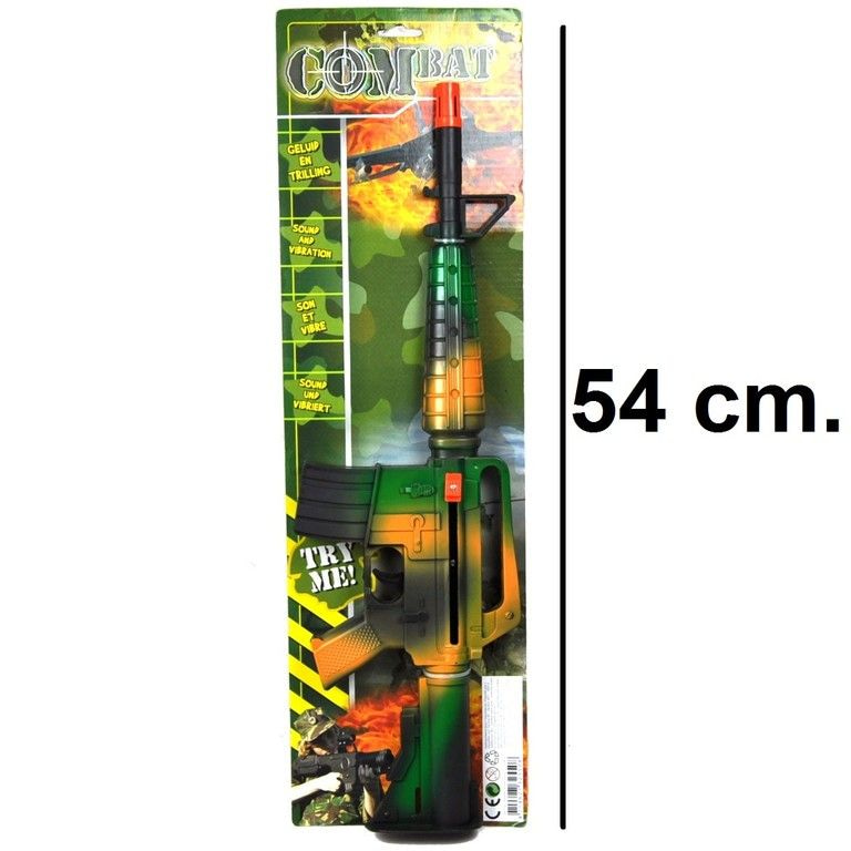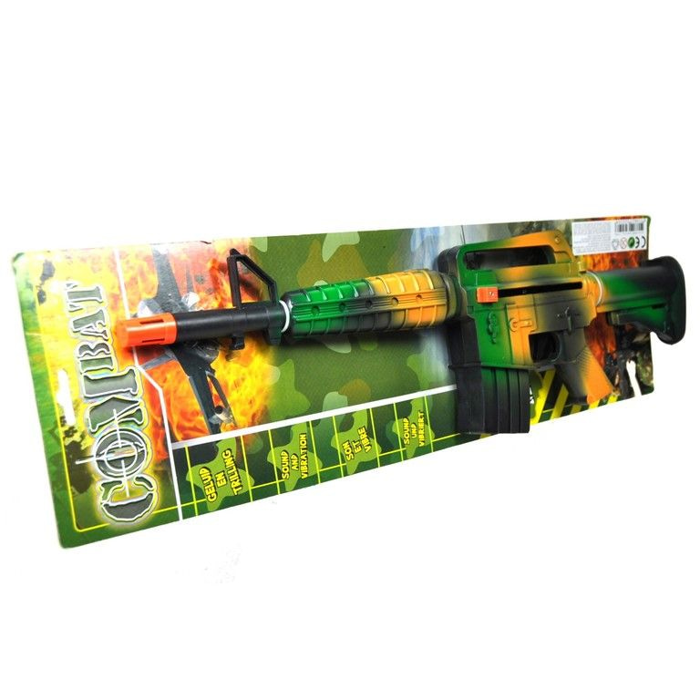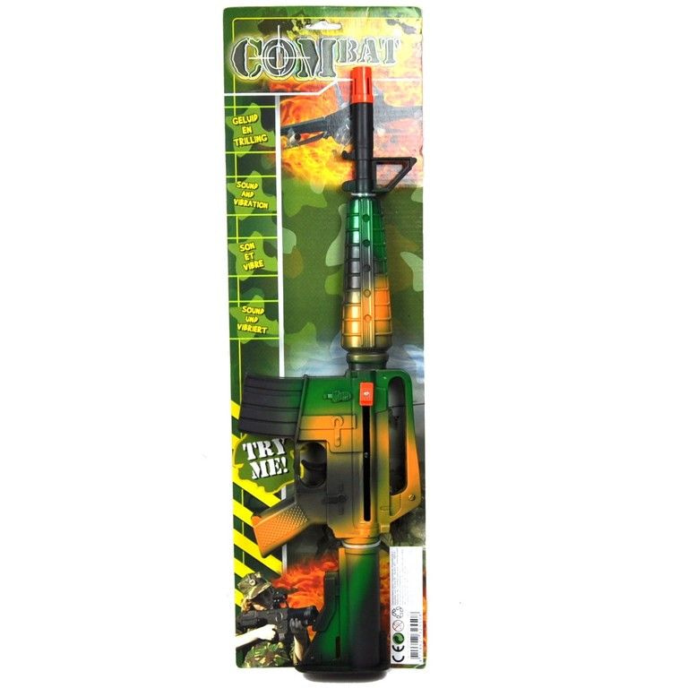 Een heel stoer geweer, net als in het leger. Een M16 waarvan je een palletje naar achteren kan trekken, daarna kun je schieten en maakt het grote geweer een rattelend geluid.