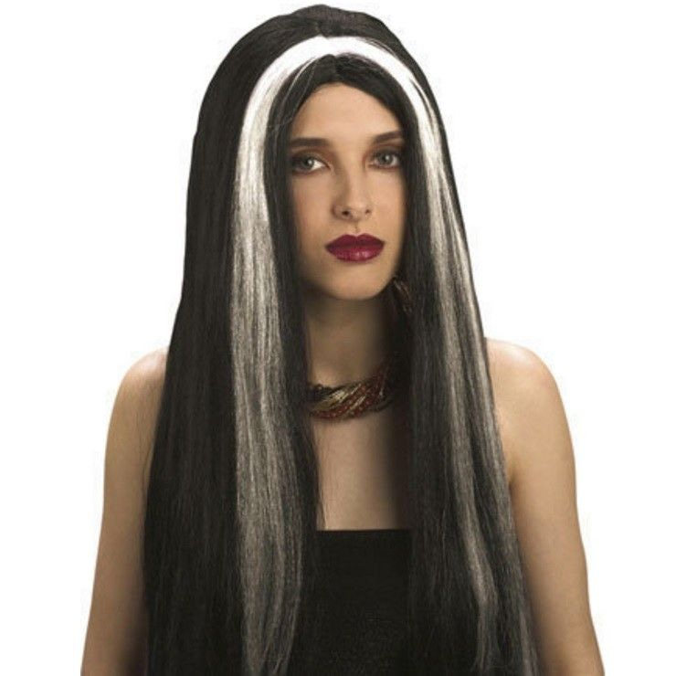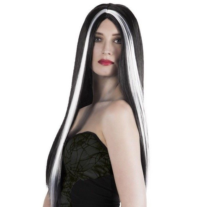 Een mooie lange pruik voor dames. Deze pruik helemaal zwart met witt highlights. Goed te gebruiken voor feesten, carnaval, halloween en andere feestelijke gelegenheden.
