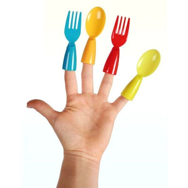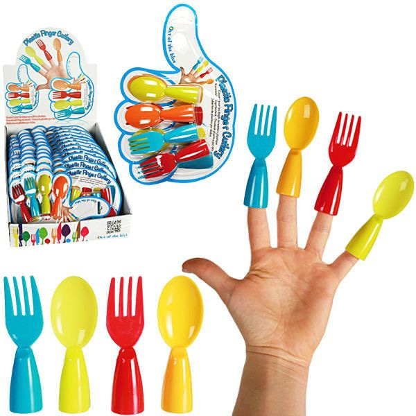 Dit is echt een leuk gadget voor kinderen. Bestek dat je bovenop je vingers zet en dan lekker gaat eten. Op elke kaart zitten 2 lepels en 2 vorken in verschillende kleuren.