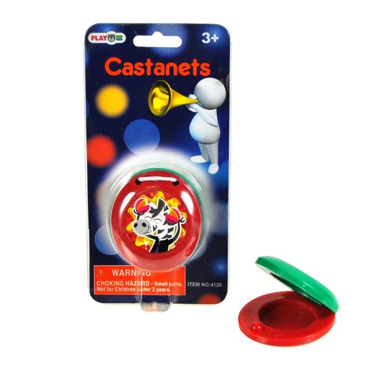 Stevige castagnetten verpakt op een blisterkaart. De castagnetten zijn een leuk instrument om muziek mee te maken. Ideaal voor in de grabbelton en/of schatkist om weg te geven.
