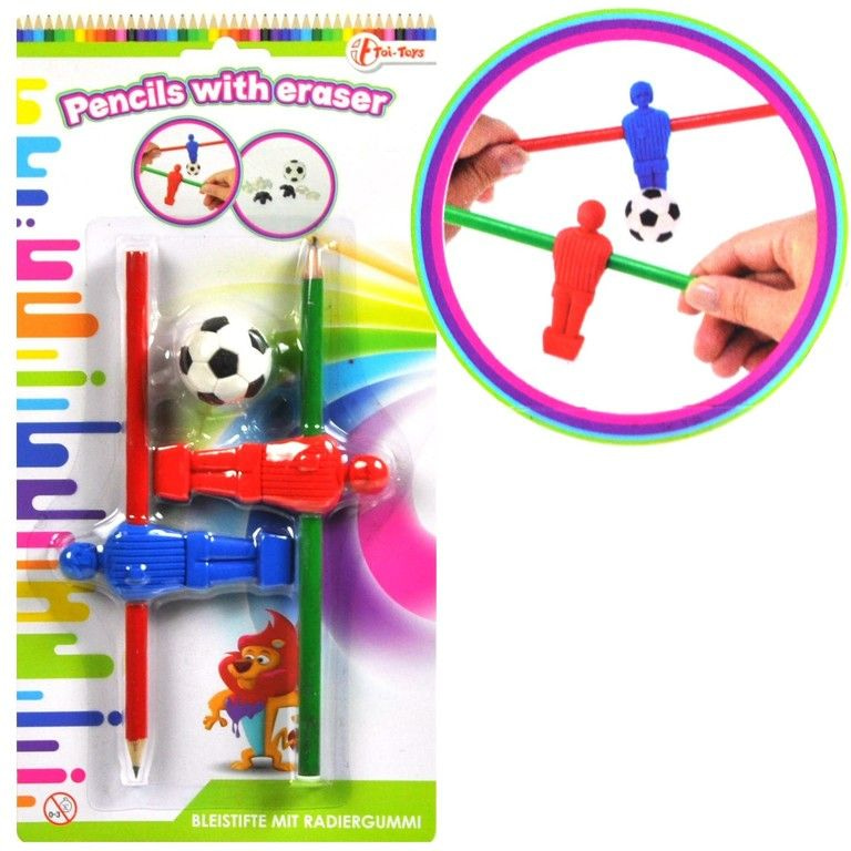 Een creatief tafelvoetbalspelletje bestaande uit 2 spelers en een bal. De spelers zijn te gebruiken als gum en de spijlen waaraan de spelers vast zitten zijn potloden. Daarnaast is de voetbal ook nog eens een gummetje. Dit is dus de ideale set om mee te spelen op school tijdens een saaie les!