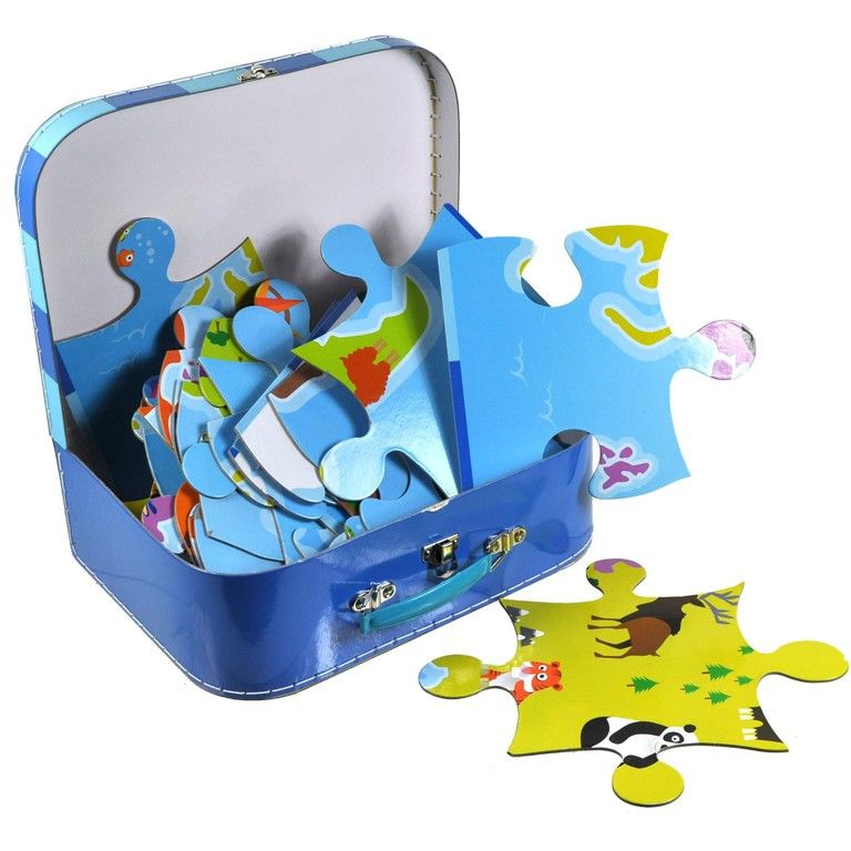 Een grote puzzel bestaande uit 24 stukjes en 91,5 x 61 cm. groot. De puzzel beeld de wereld mooi uit voor kleine kinderen. Alle stukjes zitten netjes verpakt in een koffertje met kleurrijke opdruk.
