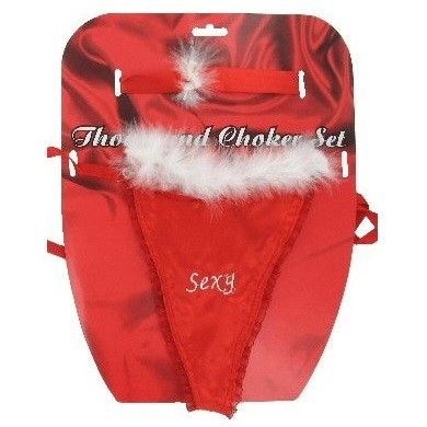 Een sexy stringetje gezamenlijk verpakt op een kaart met een choker/halsbandje. Op de stringetjes staan sexy teksten zoals: "Kiss Me", "Sexy" en "Hot Stuff".