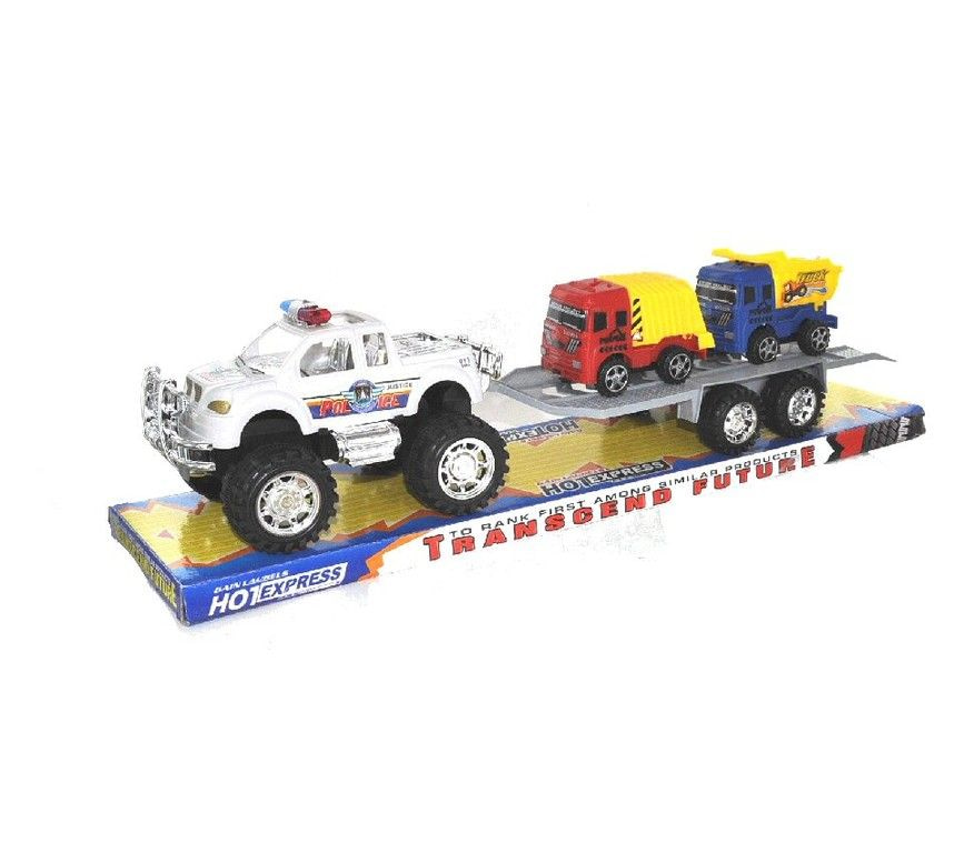 Vrachtwagens, stoere auto's, trucks etc. het is speelgoed dat nooit verveeld. Deze truck is voorzien van een oplegger met twee wagens er op.